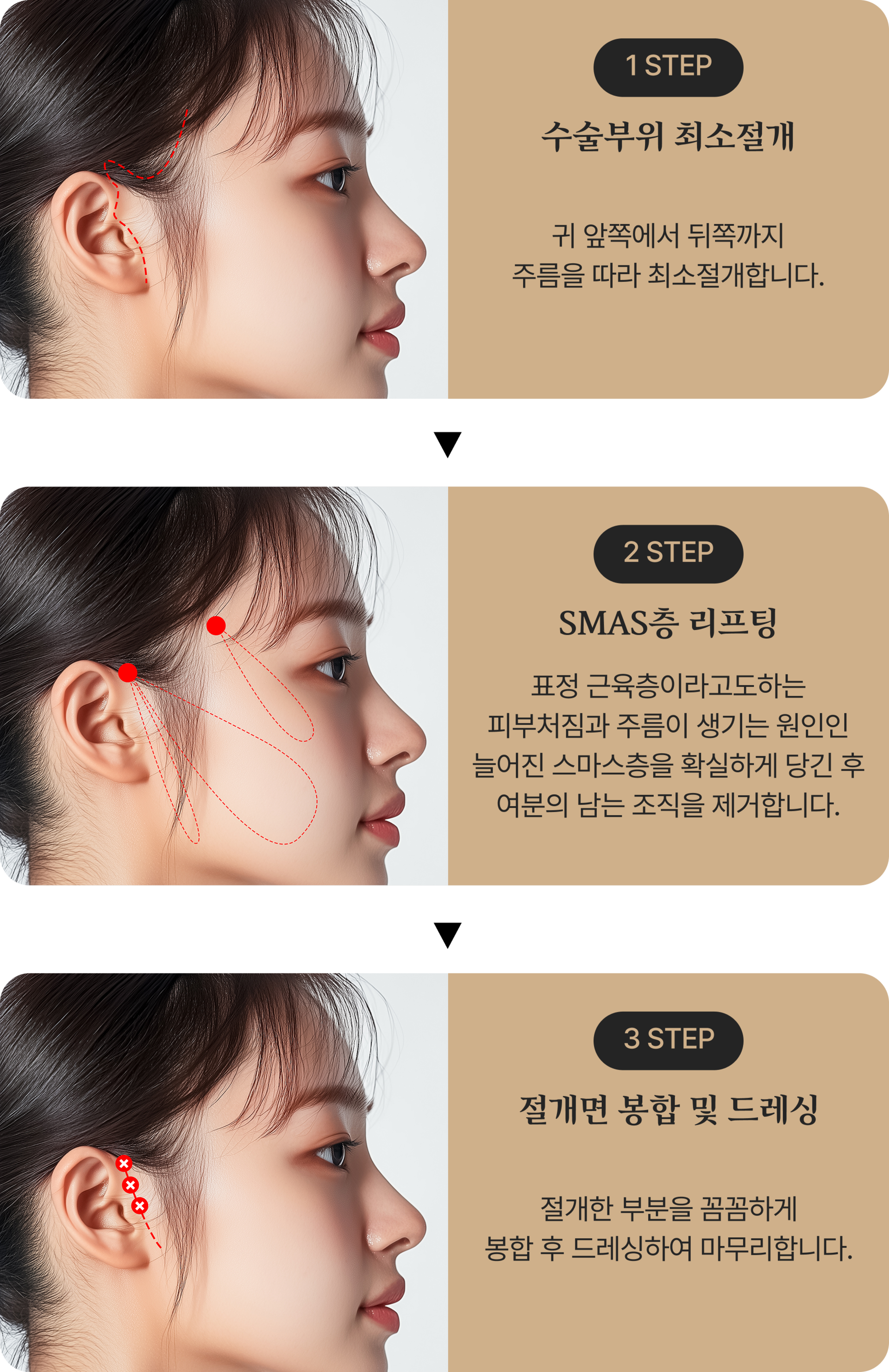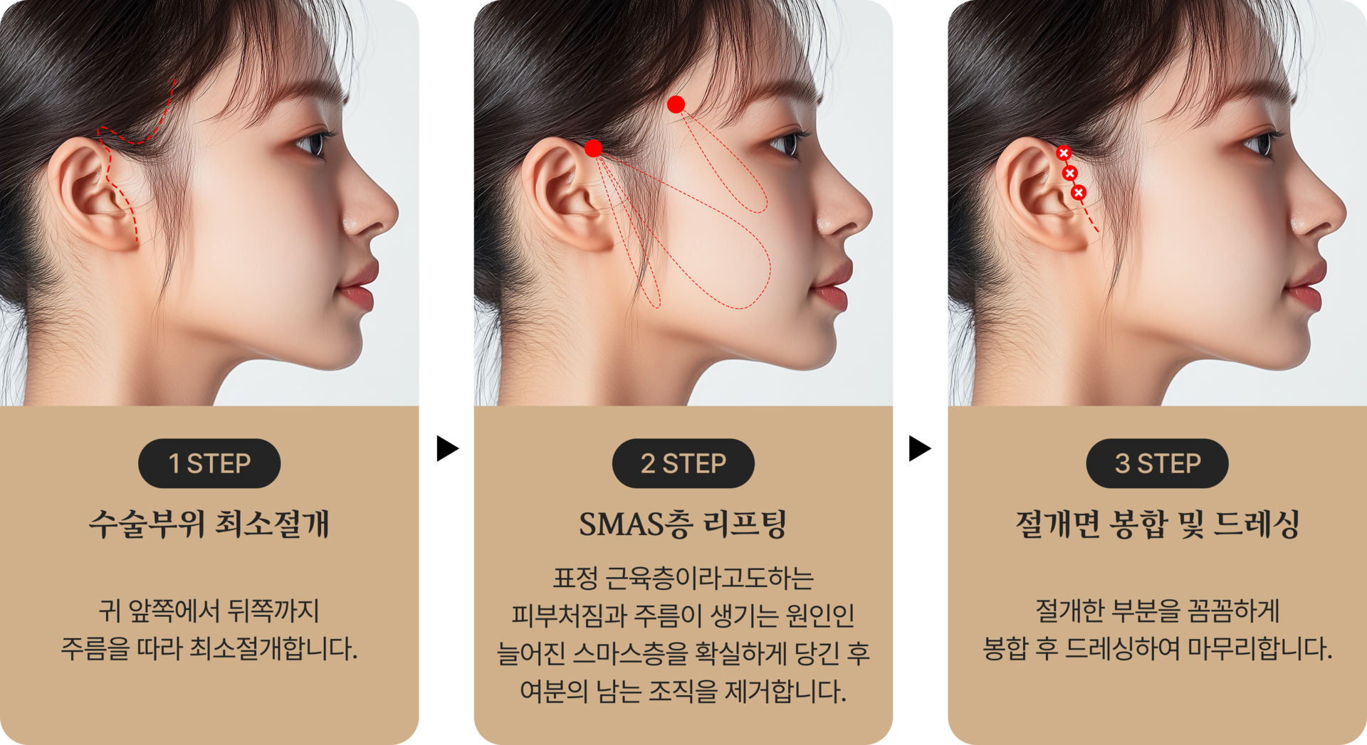 SMAS 조직을 당겨 올려, 처지고 늘어진 피부를 탄력있게